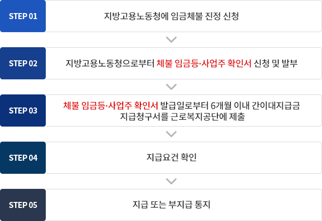 - 최대 3년 이하 징역 또는 3천만 원 이하 벌금 - 5단계: 체당금 신청 가능 (사업장 폐업 또는 지급 불가 시)