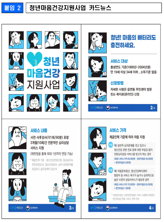 심리적 어려움을 겪는 청년들이 혼자 견디지 않도록, 정부가 직접 돕습니다. ‘청년 마음건강 바우처’는 전문 심리상담 비용을 국가가 지원하여, 정신건강 회복의 기회를 제공하는 제도입니다. 주저하지 말고 지금, 마음 돌보기를 시작해보세요.
